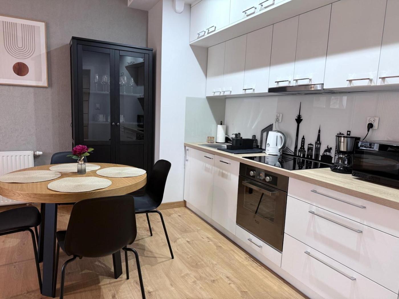 Oferta apartamentu obejmuje sypialnię (1), salon, kuchnię z pełnym wyposażeniem, w tym lodówką i ekspresem do kawy, a także łazienkę (1) z prysznicem oraz suszarką do włosów. W apartamencie zapewniono ręczniki i pościel.